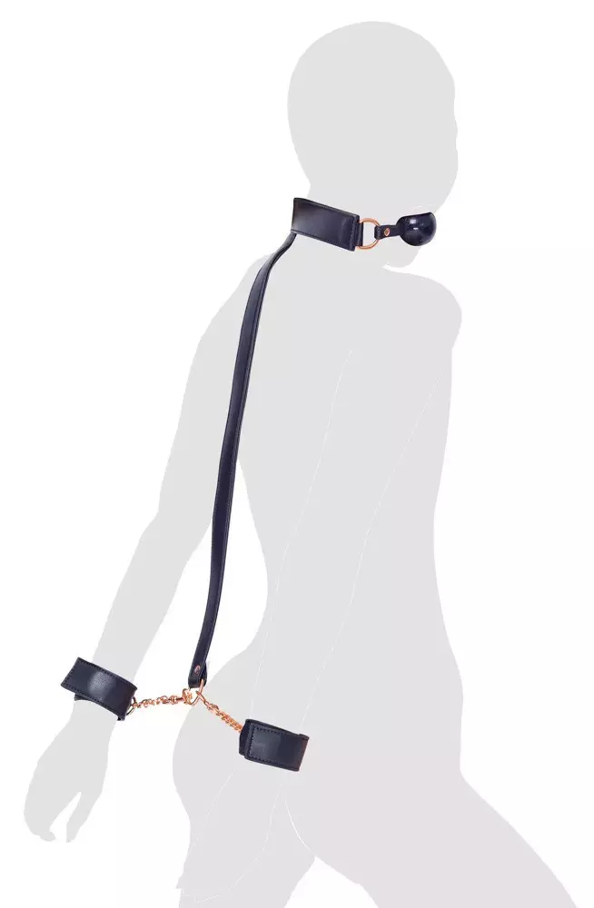 A beautiful combination of handcuffs and a ball gag! Ball gag with handcuffs from Bad Kitty in a stylish leather look with rose-gold coloured metal details. There is a strap at the back of the ball gag's head straps that is connected to the handcuffs. A person should put on the ball gag and then their hands are tied behind their back. The comfortable handcuffs and the ball gag's head strap can be put on quickly because they have hook and loop fasteners. They are also adjustable. Each handcuff has a ring, a short chain and a snap hook – they can be removed from the connection strap with a ring.